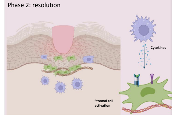 Stromal cells produce extracellular matrix i.e fibrin and epithelial cells regenerate to restore tissue architecture.