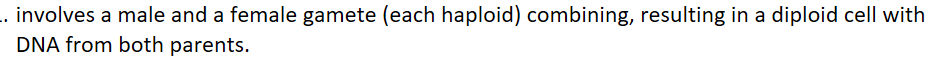 involves a male and a female gamete (each haploid) combining, resulting in a diploid cell with DNA from both parents.