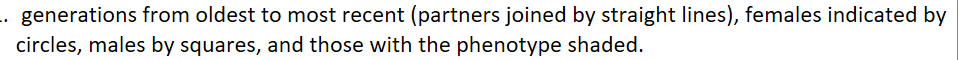 generations from oldest to most recent (partners joined by straight lines), females indicated by circles, males by squares, and those with the phenotype shaded. Siblings are from youngest to oldest, a line in between is marriage, line horizontal means child