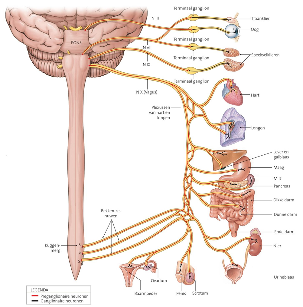 preganglionaire neuronen vanuit de hersenstam (oculomotorius, fascialis glossopharyngeus en vagus) en het sacrale ruggenmerg (S1 – S4) verbonden met het doelorganen (terminaal ganglion)
