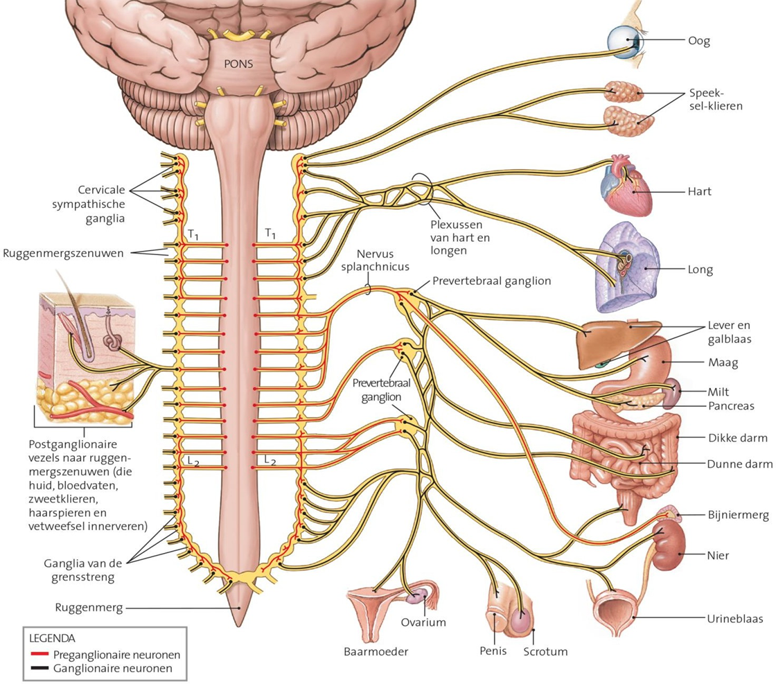 preganglionaire neuronen zijn vanuit het ruggenmerg (T1 – L2) via postganglionaire (perifere ) neuronen verbonden met somatische structuren (huid) en viscerale organen