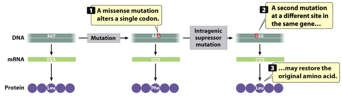 a second mutation that occurs in a different gene from the original mutation, and it counteracts the original mutation's effects to restore the normal phenotype