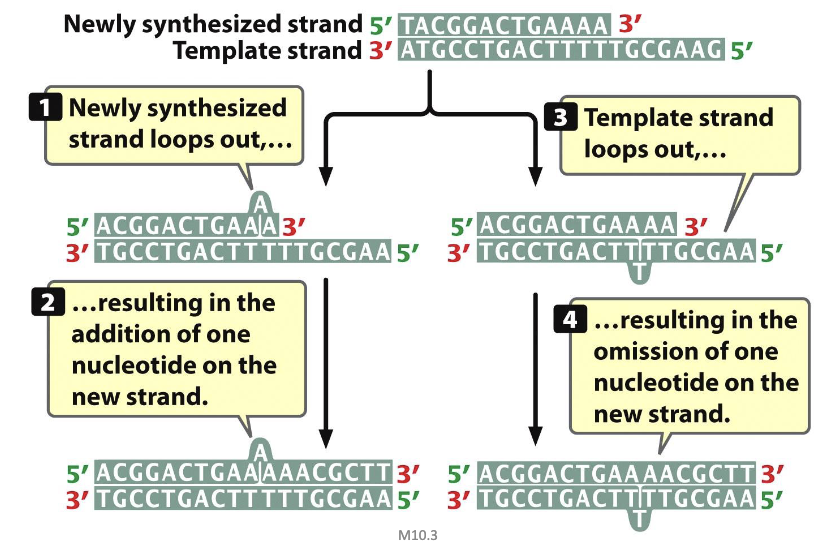 insertion/deletion owing to slipped-strand mispairing during DNA replication