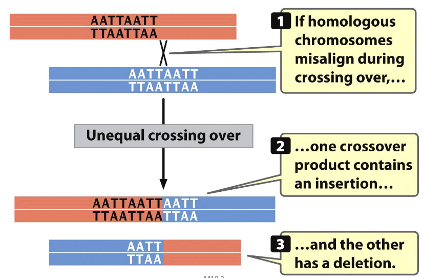 unequal crossing over of misaligned chromosomes during meiosis generates duplications, and deletions