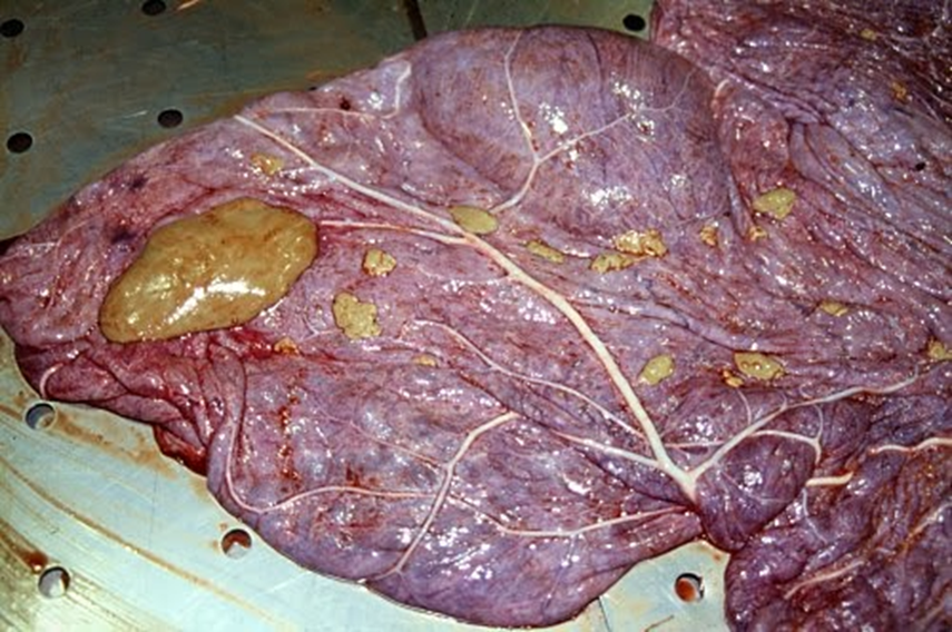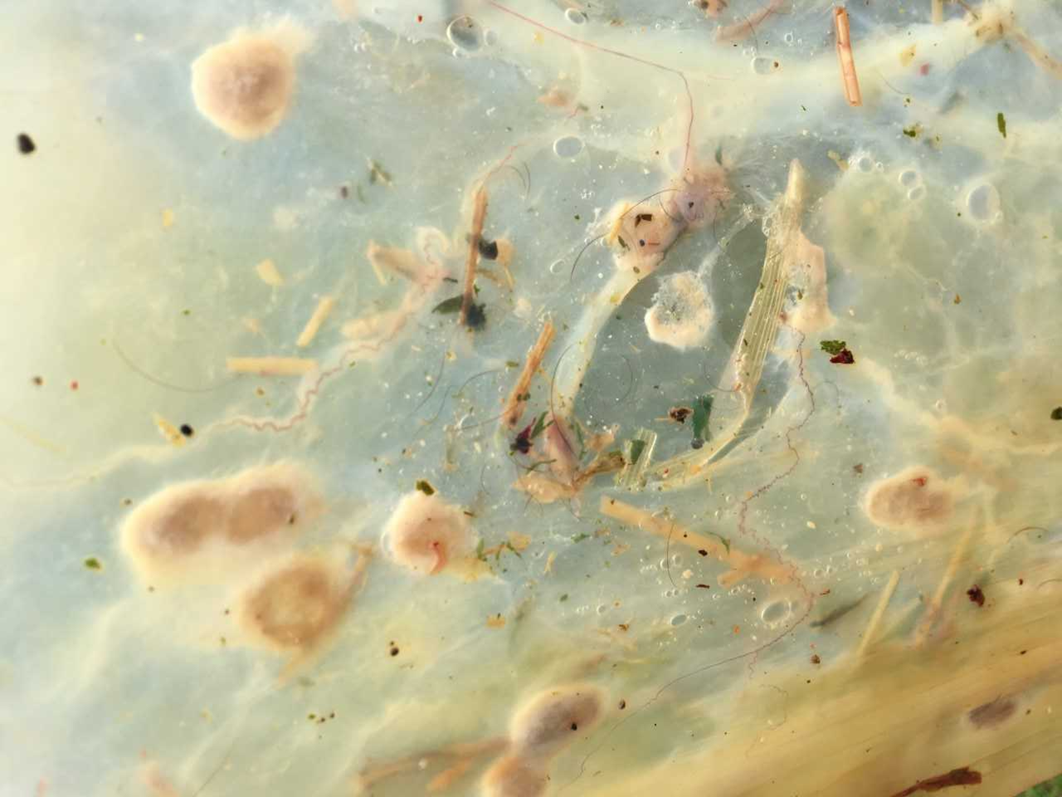 rubbery mass of fetal waste and mucus found in the allanotic fluid