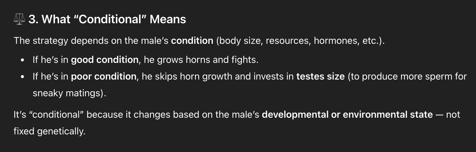 conditional tactics: Behavior changes depending on the individual’s condition or environment.