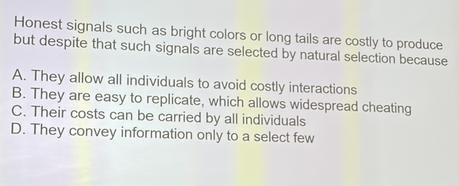 Signals usually have costs to produce or maintain — only strong or healthy individuals can afford them.