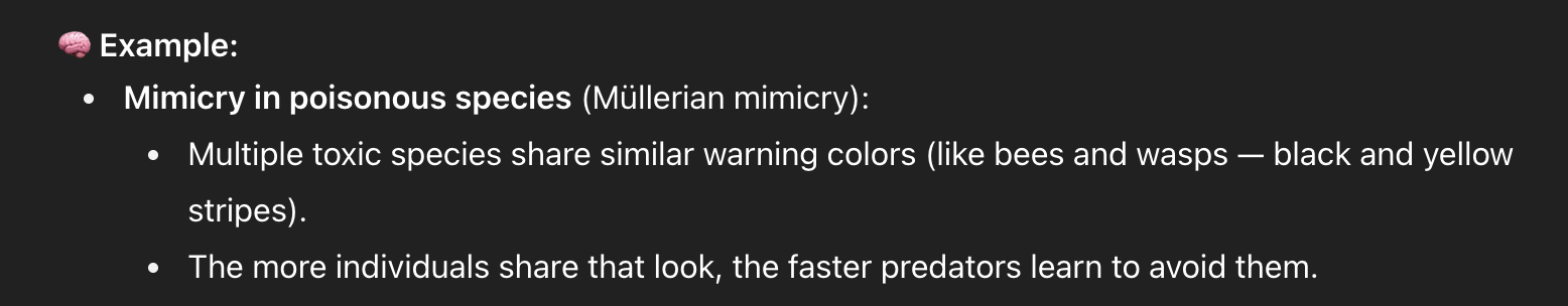 female fish are biased to being attracted to something orange because of food, so if a male happens to be orange, that male will attract more females so that orange male will leave behind offspring who are also orange and that’s how orange will evolve over time