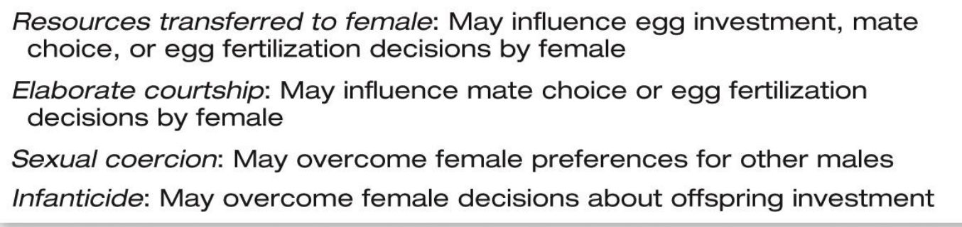 After mating, males want to ensure paternity — that the offspring the female produces are theirs so they develop methods to ensure their own sperm binds with the females egg