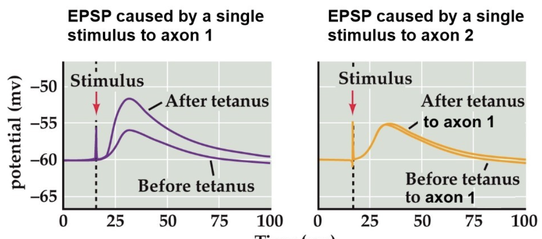 Specificity | Only the active synapses are strengthened during LTP | Activity at a particular synapse; glutamate release + postsynaptic depolarization | One stimulated synaptic pathway is potentiated, while a nearby inactive pathway is unchanged | Ensures memories are precise, not global or diffuse |
