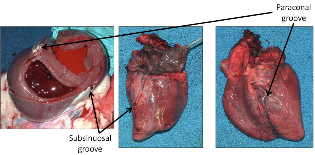 What are the two key external grooves used to orient the heart?