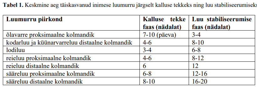 Tavaliselt tekib kallus pärast luumurdu keskmiselt 3-10. nädala jooksul, luu stabiliseerumise faas on kalluse tekke faasist kaks korda pikem.