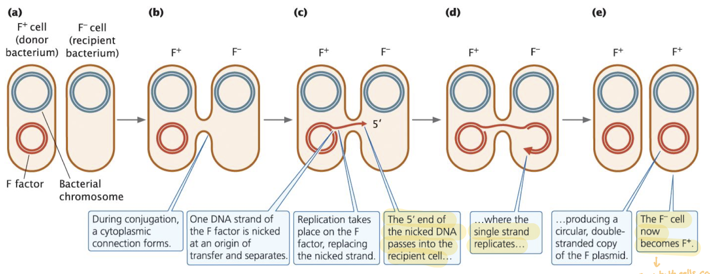 Cells with the F factor are called F+ (donor); cells lacking it are F- (recipient)
