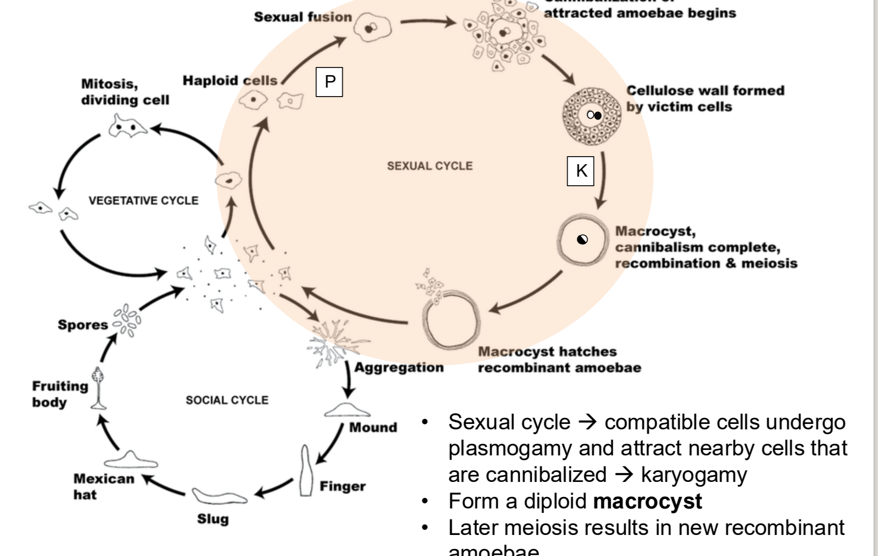 when they run out of food they aggregate, forming pseudoplasmodium with cAMP, and move as a slug to optimal spore dispersal location