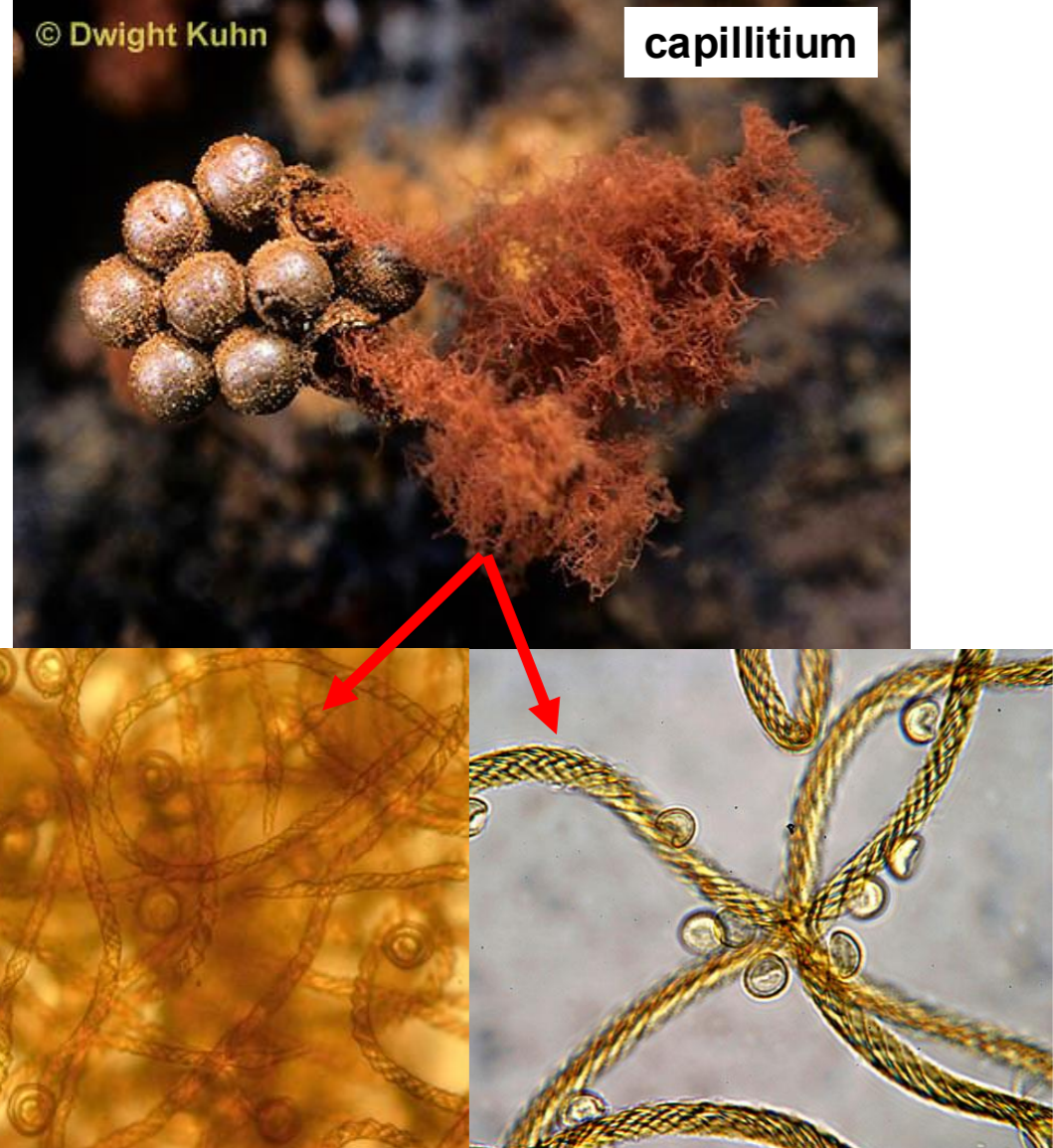 thick hyphal-like cords that provide structure and retain the spores for wind dispersal made by caco3 in slime molds