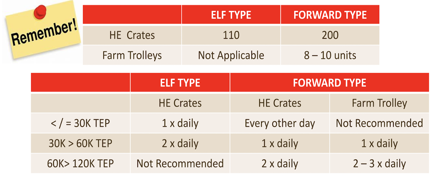 packaging (trolleys or crates), flock age and health status, daily production capacity, egg van capacity, farm location or distance
