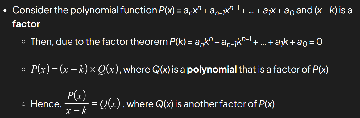 Note, when P(k) = 0 then (x - k) is a factor of P(x)