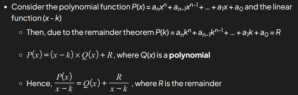 When any polynomial P(x) is divided by any linear function (x - k) the value of the remainder R is given by P(k) = R