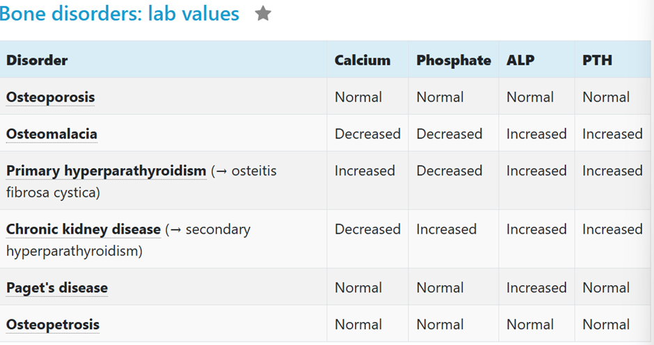 Calcium, phosphate, ALP, PTH in 1) Osteoporosis? 2) Osteomalacia? 3) Primary hyperparathyroidism? 4) CKD? 5) Paget’s disease?