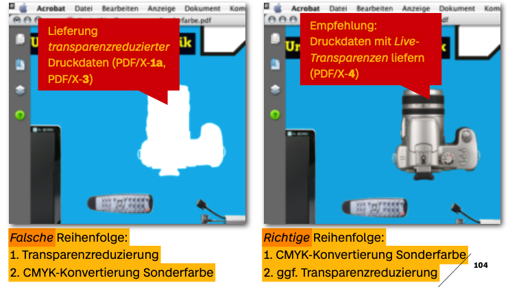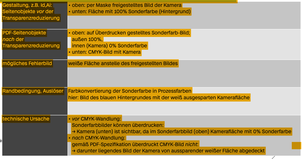 Überprüfung von technischen Aspekten, die sich auf das Farbergebnis (Gestaltung) auswirken (korrekte Verarbeitung von Objekteigenschaften, Verarbeitung von Transparenzobjekten, korrekte Verarbeitung von PDF-Konstrukten)