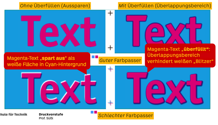 Farbfehlpasser können nicht gänzlich ausgeschlossen werden (Papierverzug durch Feuchtigkeitsaufnahme, leichte Abweichung der Papierposition in den Druckwerken, …).