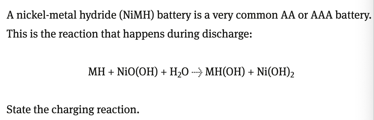 recharching is when the chemical reaction is reversed by the use of an electrical current to drive the reaction back to its orginal state (turn products back into reactants)