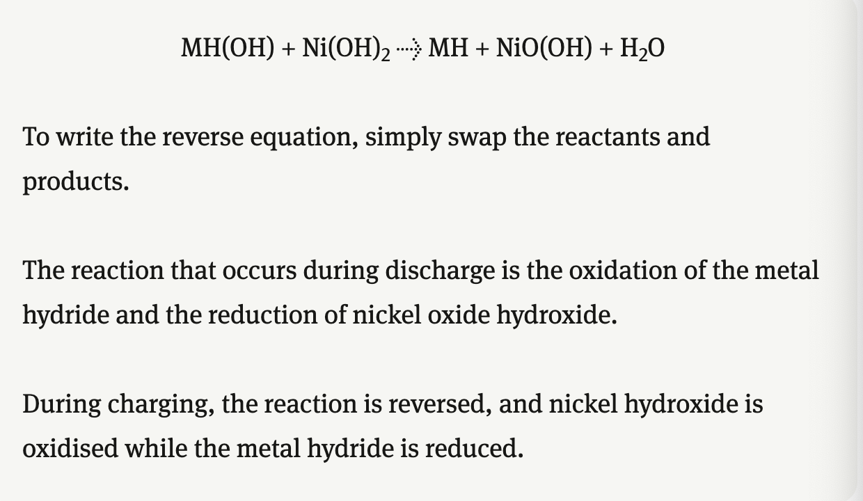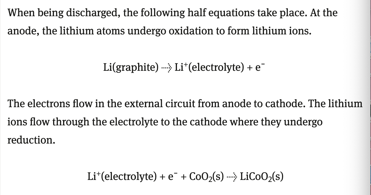 Note that when being recharged, the two half equations above are reversed. During charging, lithium ions flow from the cathode to the anode through the electrolyte. This process stores energy in the battery. During discharging, the lithium ions flow back from the anode to the cathode through the electrolyte, generating an electric current that can be used to power devices.