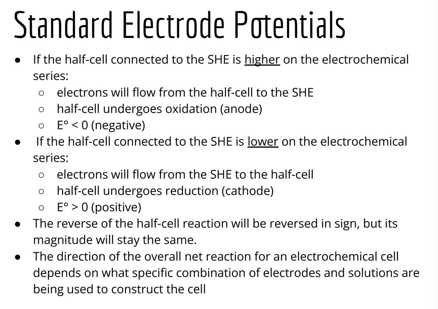 explain what happens if the half cell connected to the SHE is higher or lower on the electrochemical series