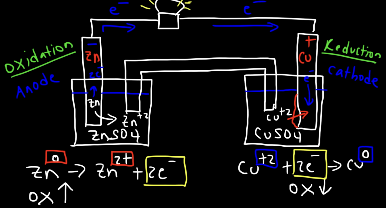 the electrons that are oxidized off the species in one half reaction travel across the wire to reduce the species on the other half