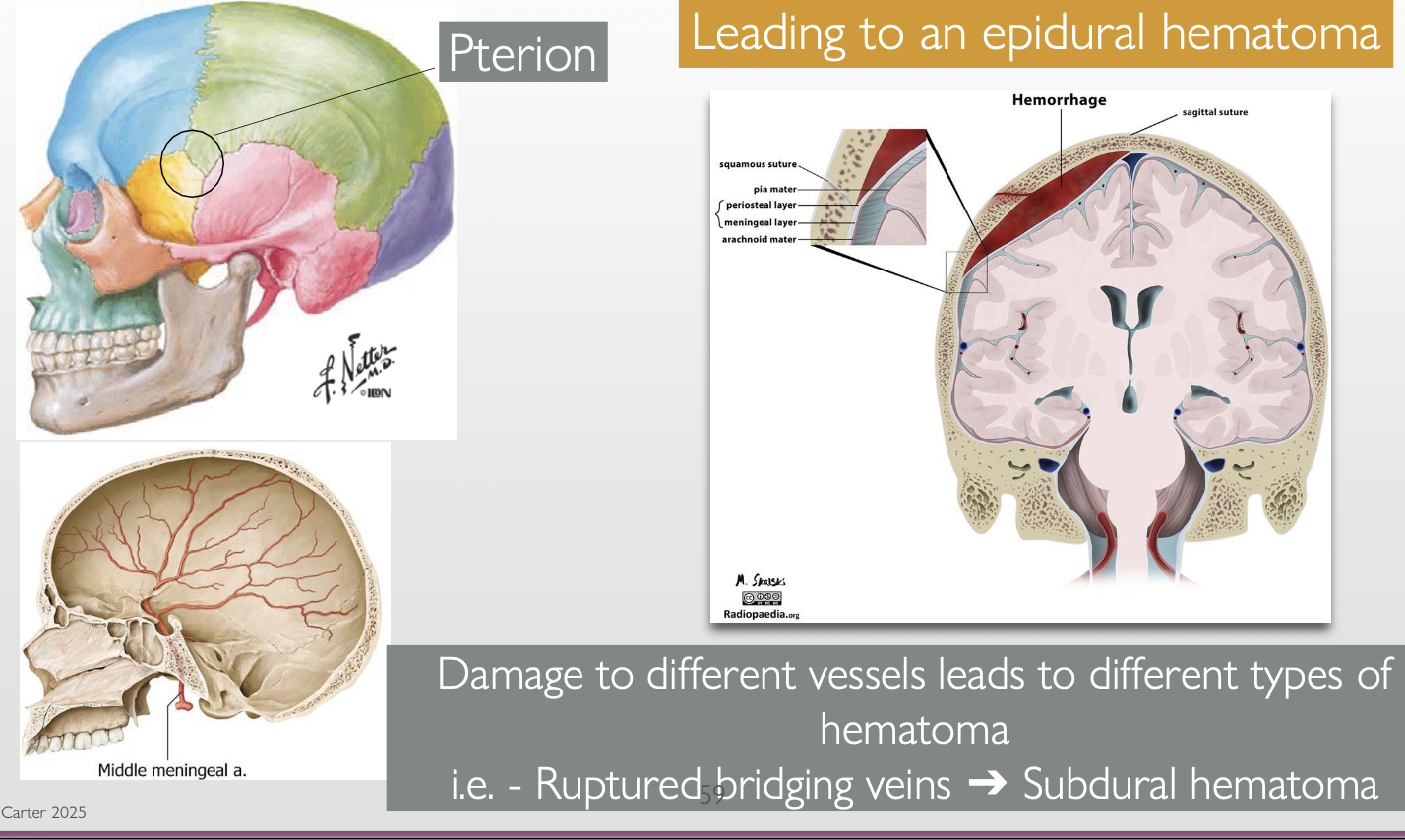 Epidural hematoma: bleeding b/w the dura & skull that rapidly ↑ intracranial pressure