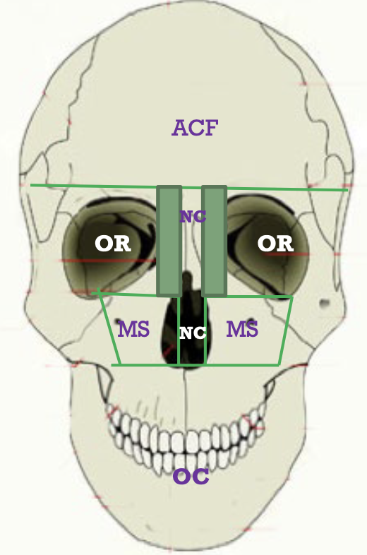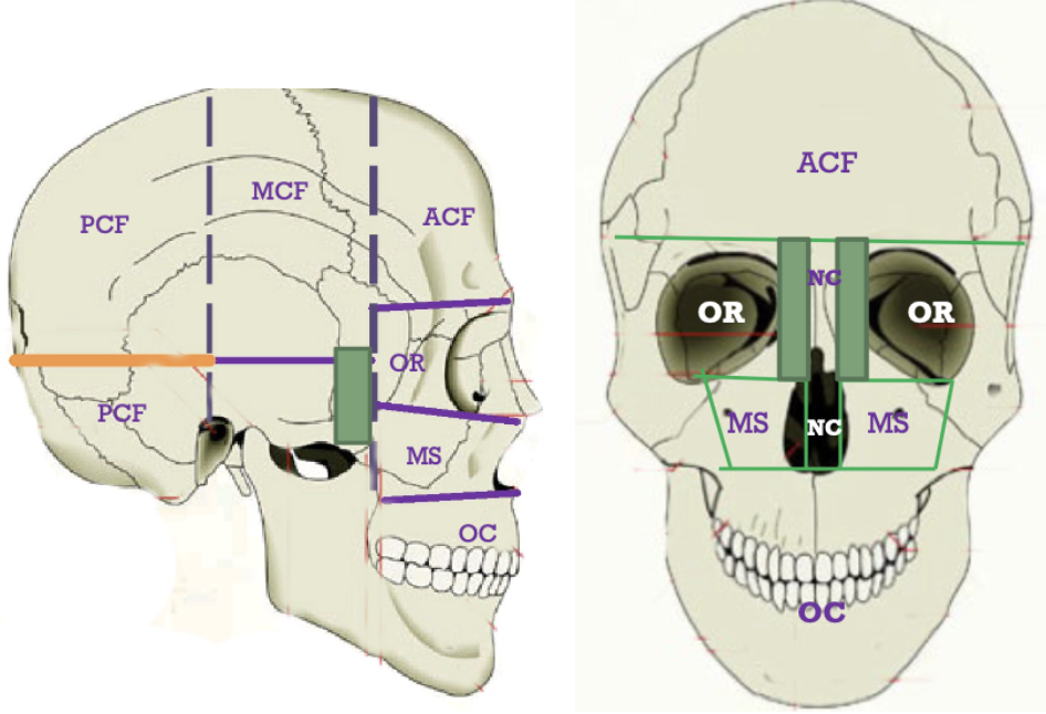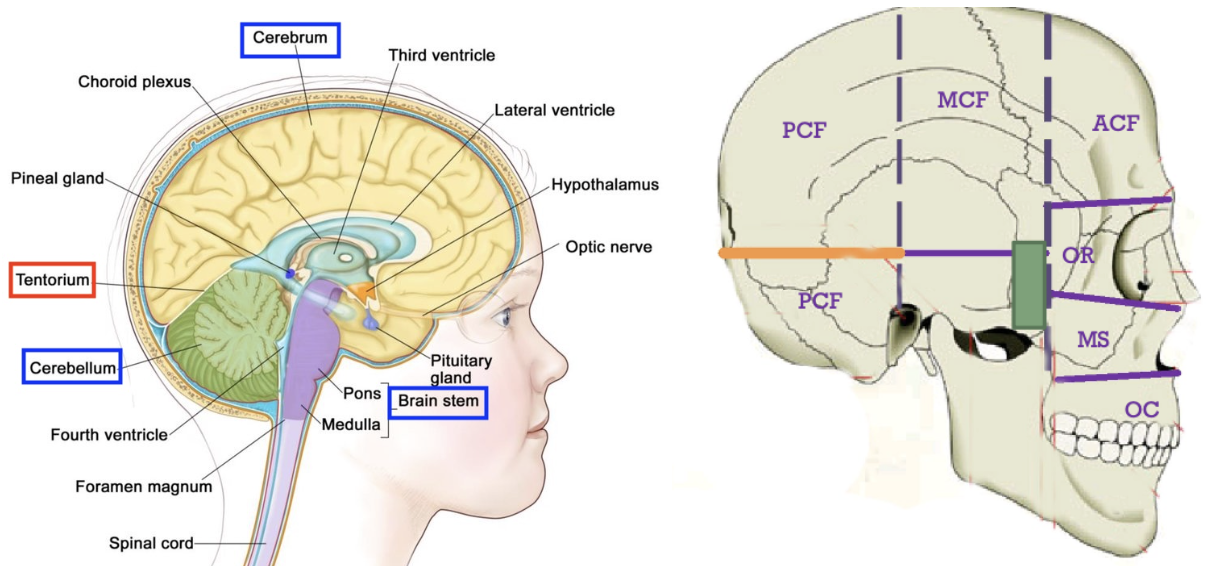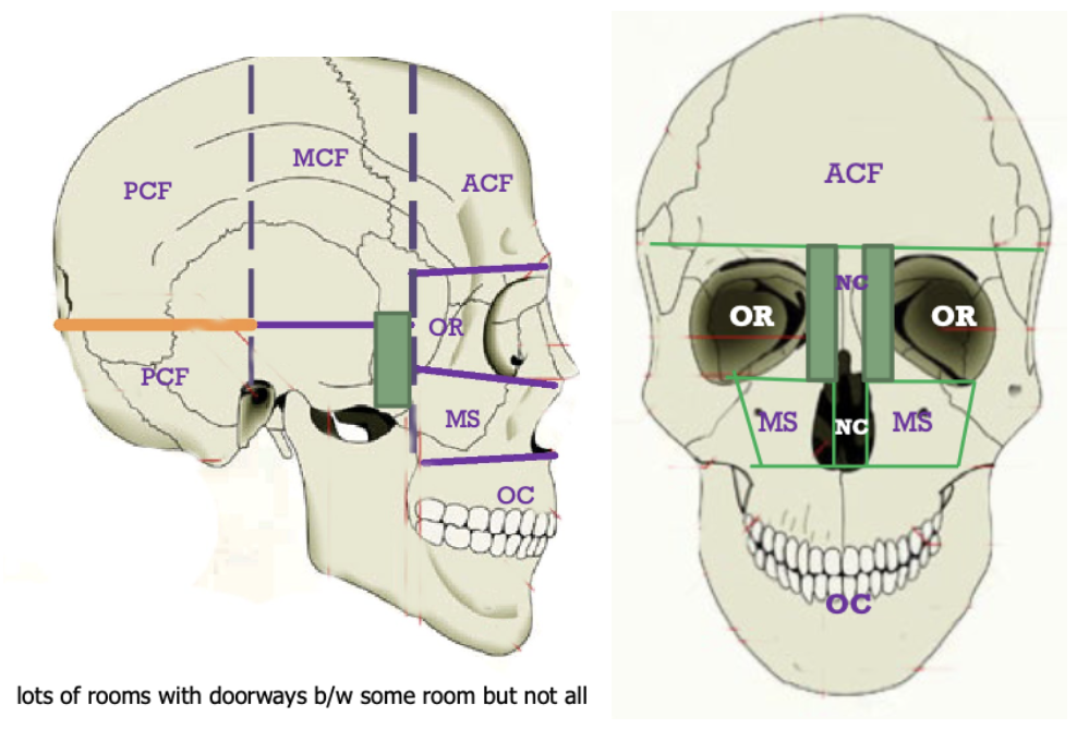 Label the main rooms of the house laterally and frontally. Mentions which rooms the 3 main rooms (ACF, MCF, PCF), can’t directly connect to.
