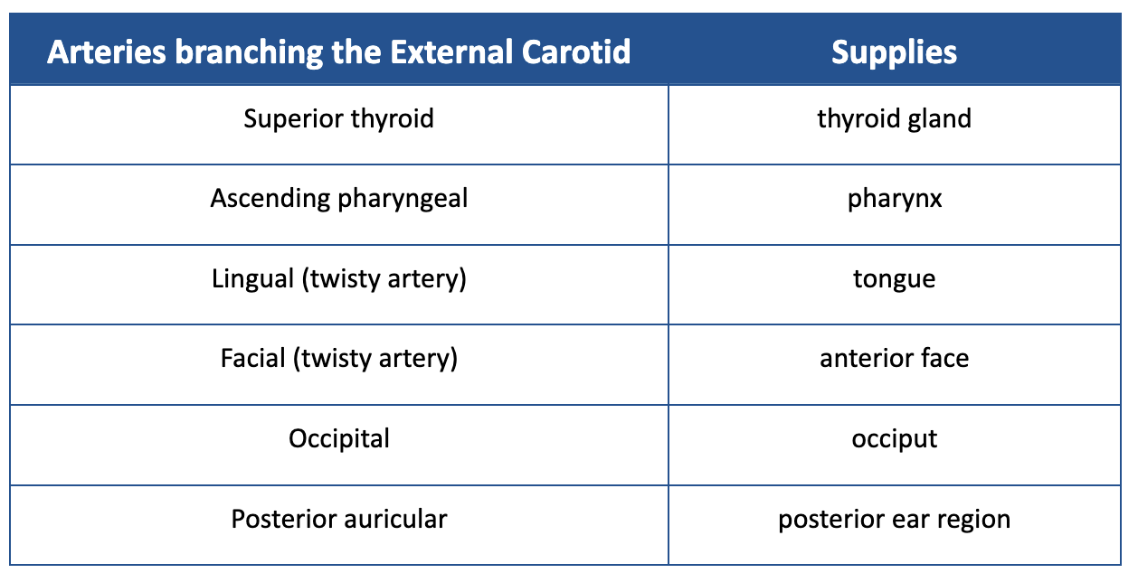 List the Terminal branches of the External Carotid Artery. Mention what they supply.
