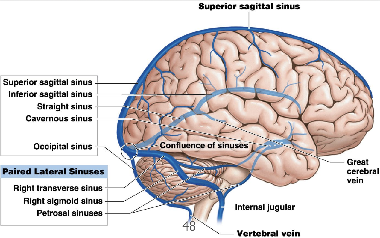 → endothelium-lined venous channels located b/w the 2 layers of dura mater