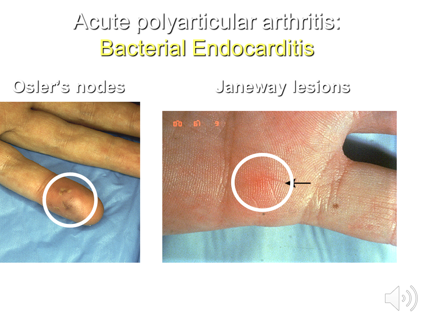 Bacterial Endocarditis is an infection of the endocardium of the heart which can lead to an acute or subacute presentation of polyarticular arthritis