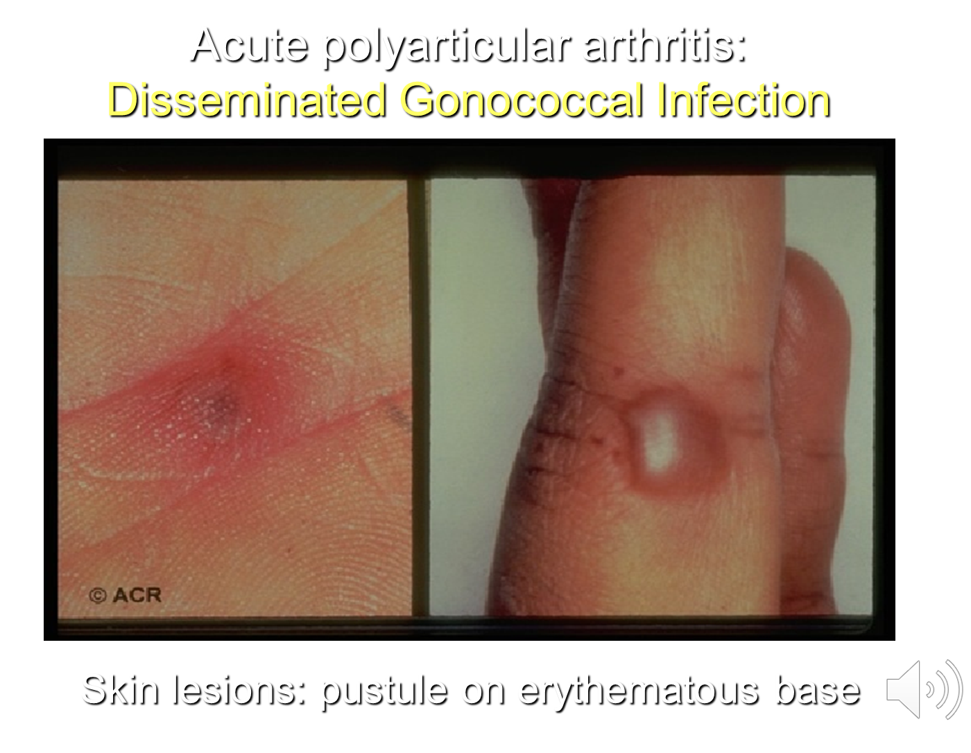 Disseminated Gonococcal Infection is caused by infection of Neisseria Gonorrhea and is a common cause of septic arthritis in teenagers