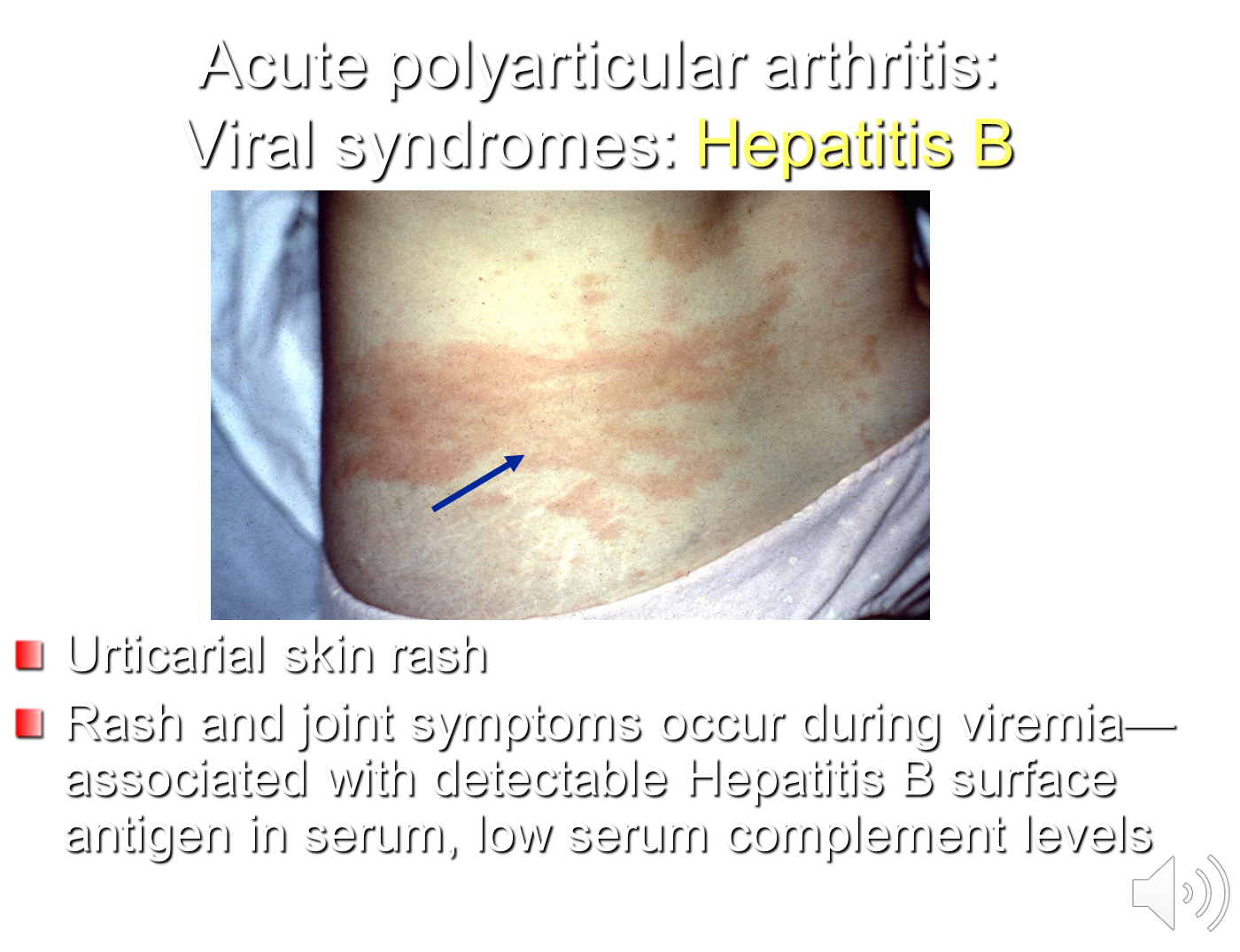→ the rash and symmetric polyarthritis occur during viremia so you should be able to detect Hepatitis B along with low serum complement levels