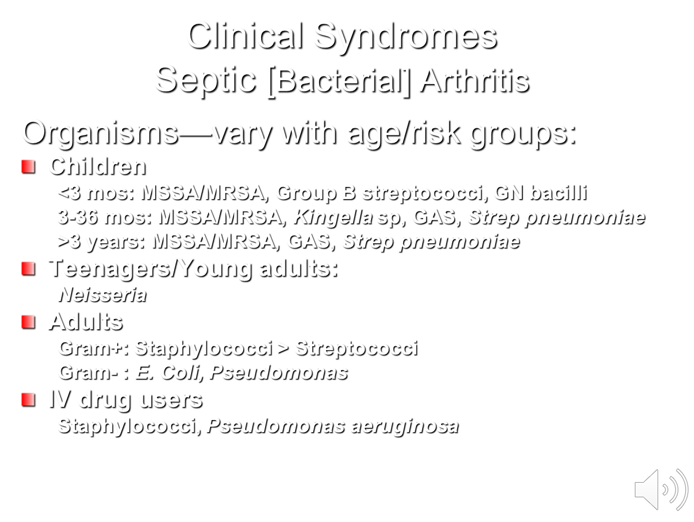 The causative organism for septic arthritis will vary by age and risk factors and where they affect