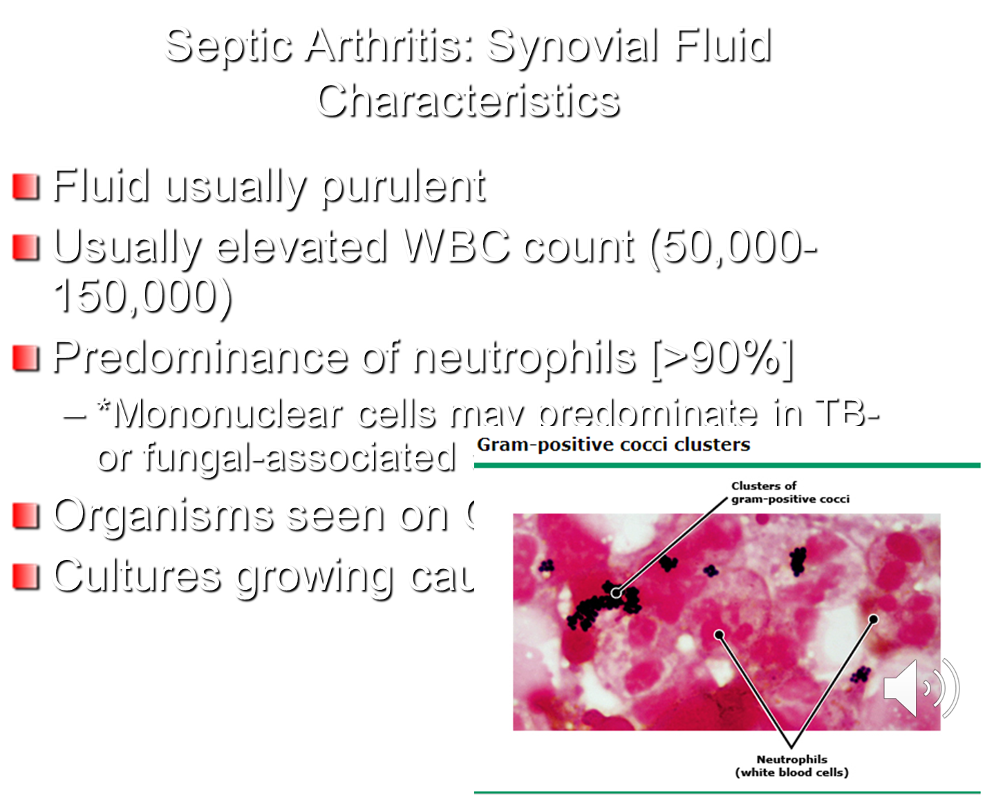 3) When drawing fluid from the area, it will be purulent, have a high WBC count that is predominantly neutrophils, and will have the organism appear on gram-stain