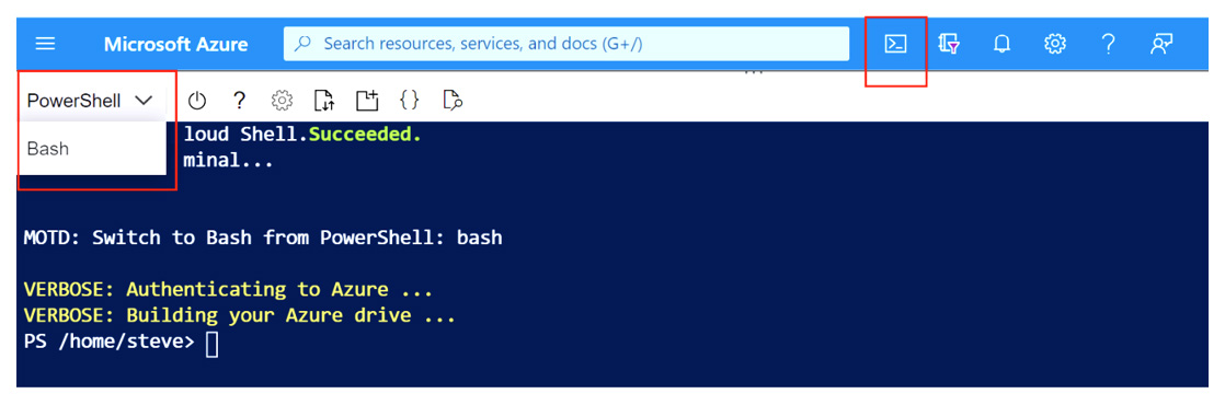 Cloud Shell can be accessed directly within the Azure portal via the code icon at the top of the portal toolbar, as shown in the above screenshot: