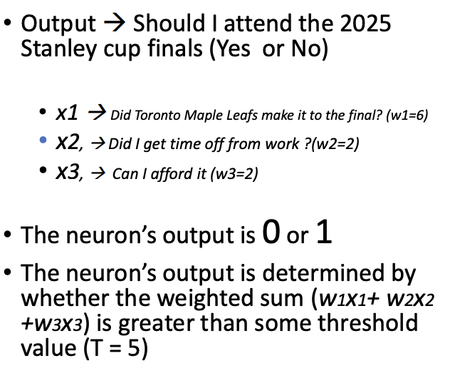 the neuron’s output is determined by whether the weighted sum (w1×1 + w2×2 + w3×3) is greater than some threshold value