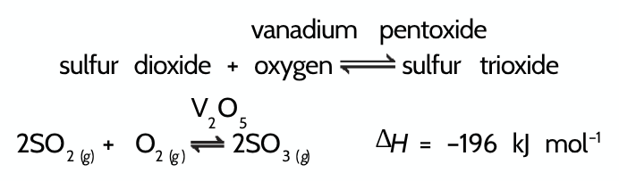 Write an equation for the manufacture of sulfuric acid + state whether exothermic or endothermic going forward: