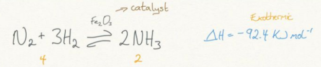 Write an equation for the manufacture of ammonia + state whether exothermic or endothermic going forward: