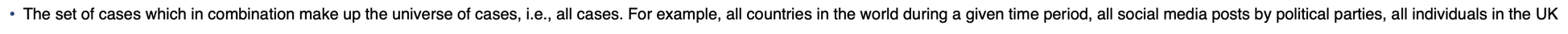 The set of cases which in combination make up the universe of cases, i.e., all cases. For example, all countries in the world during a given time period, all social media posts by political parties, all individuals in the UK