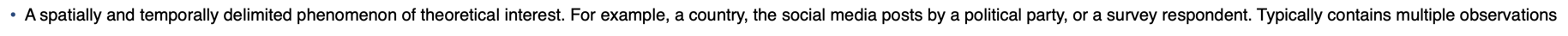 A spatially and temporally delimited phenomenon of theoretical interest. For example, a country, the social media posts by a political party, or a survey respondent. Typically contains multiple observations