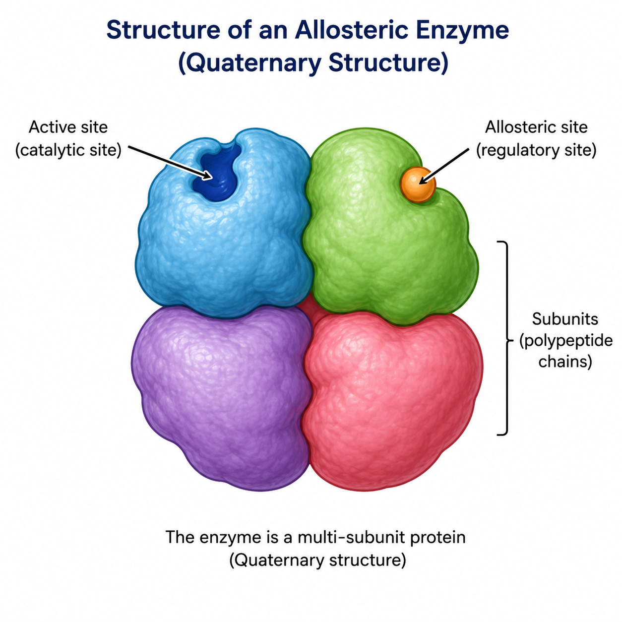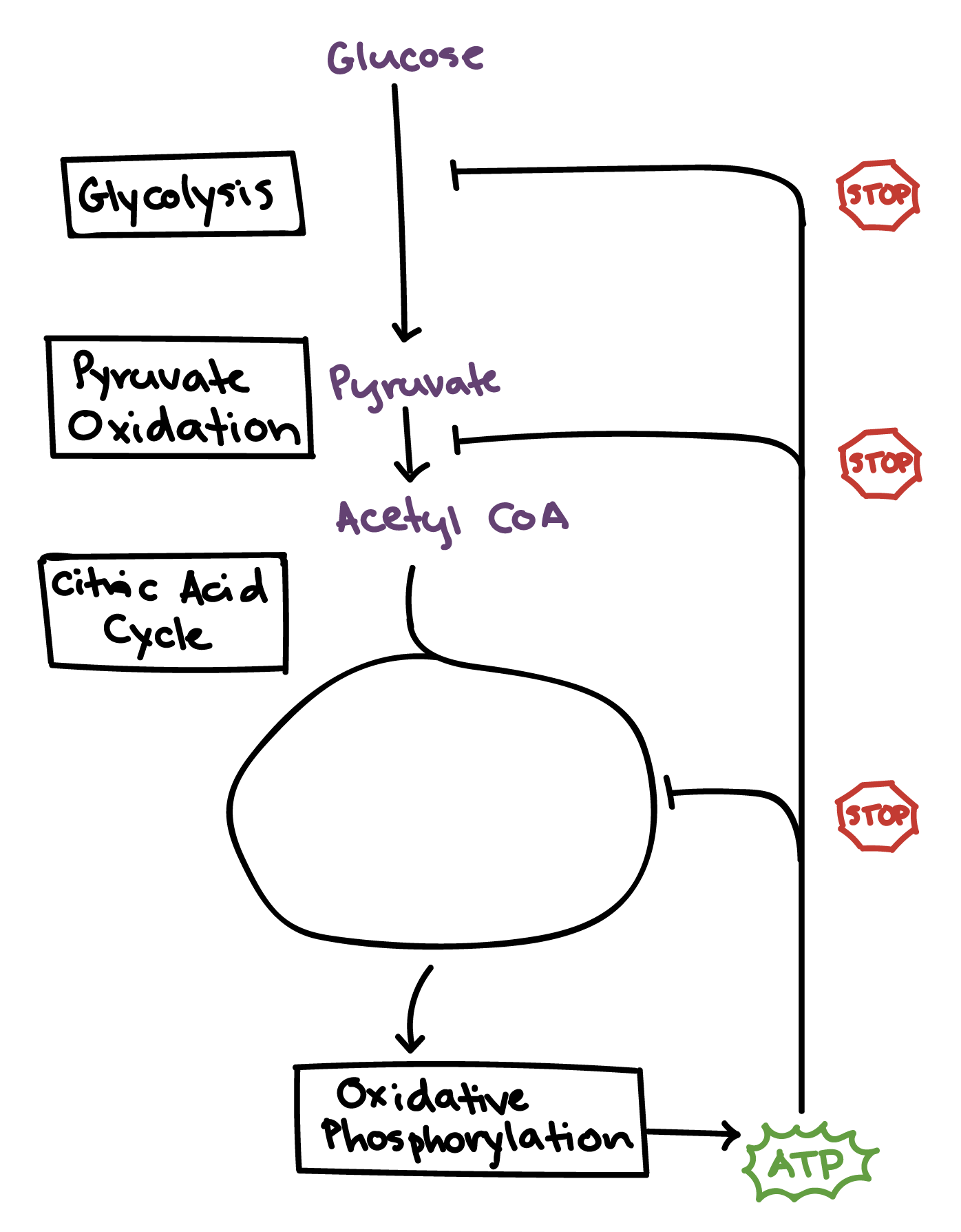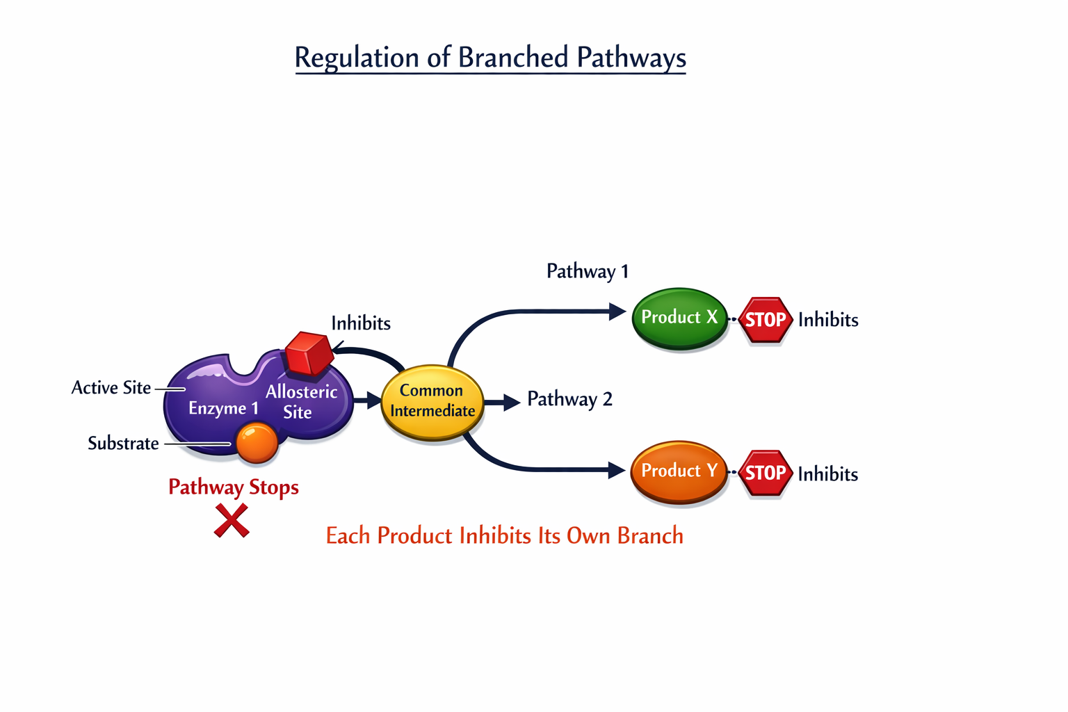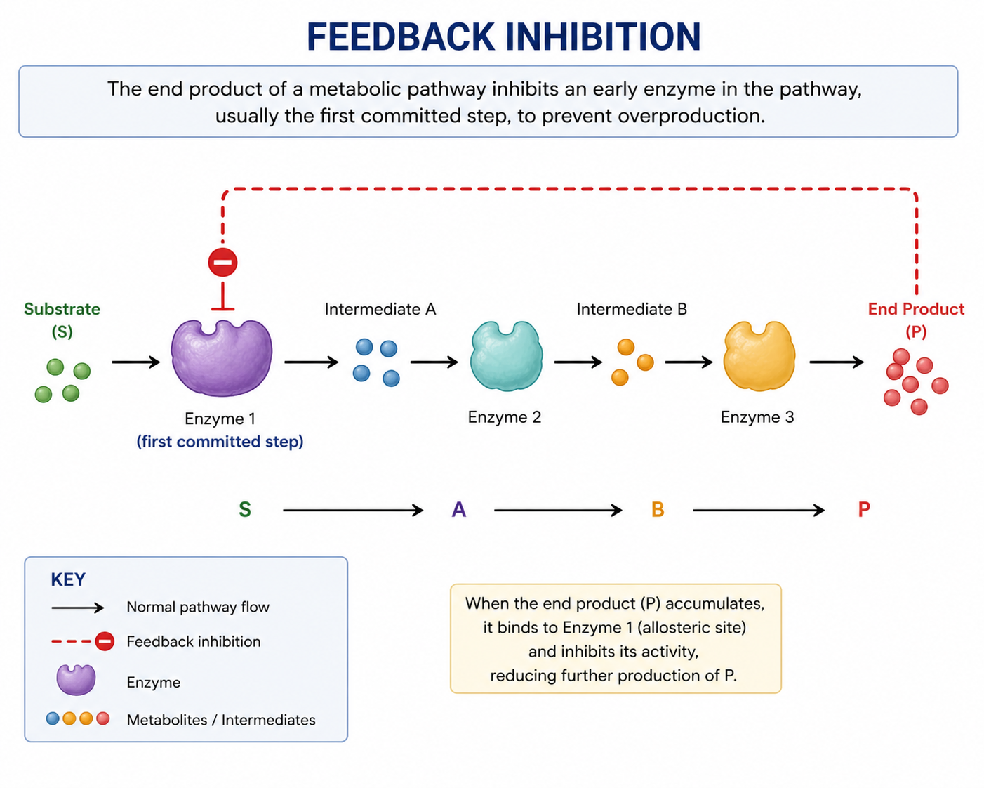 ATP binds to enzyme (in its own production pathway) —→ enzyme changes shape —→ pathway slows down —→ less ATP made —→ ATP levels drop —→ enzyme reactivates —→ STARTS AGAIN