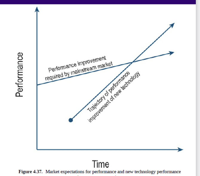 Disruptive innovations evolve quickly on existing performance metrics and can eventually meet market needs.