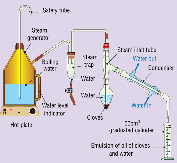 Key steps + observations in the procedure for the extraction of clove oil from cloves by steam distillation: