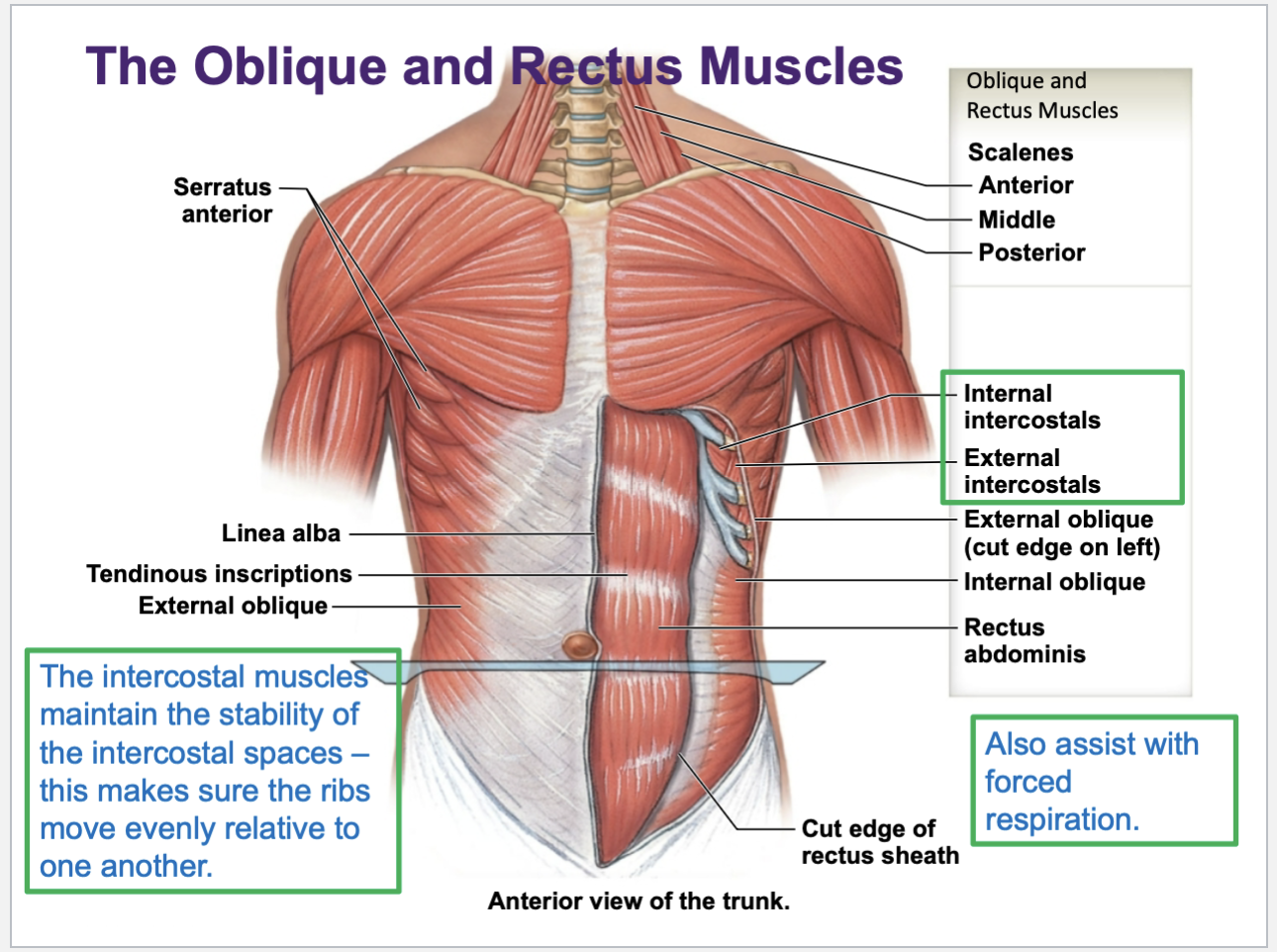 thin layers of muscle found in b/w adjacent ribs. Main ex of this group are the external intercostals and internal intercostals. The externals assist w forced inspiration. internals assist with forced expiration