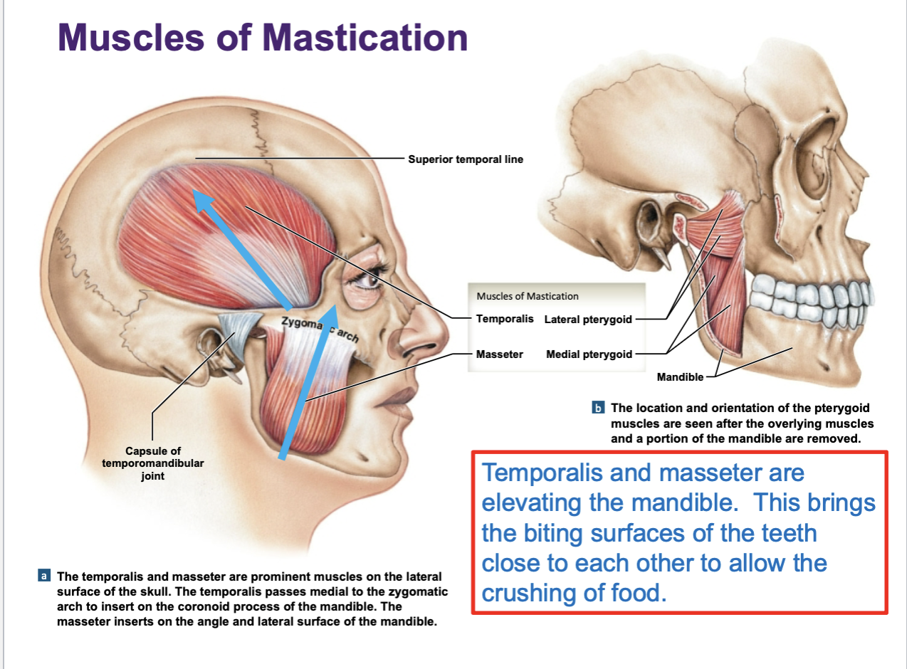 for the most part, these muscles are working to elevate the mandible so that the biting surfaces of the teeth are brought closer together to crush food