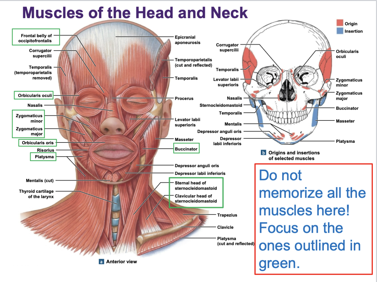 Facial expression focus on these: occipitofrontalis, orbicular oculi, orbicularis oris, zygomaticus major/minor, platysma